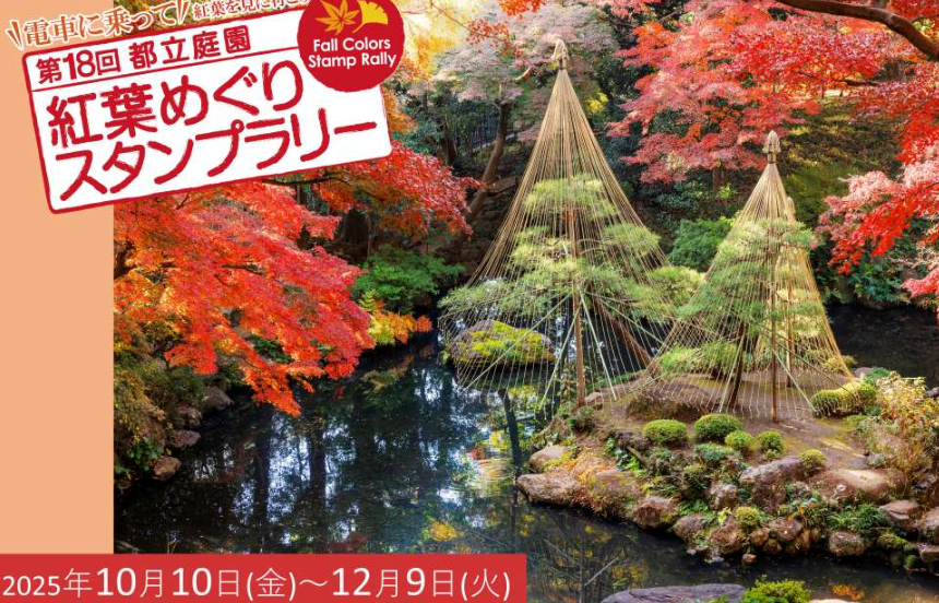 都立9庭園では、今年も紅葉の時期に合わせ、「都立庭園紅葉めぐりスタンプラリー」を開催します。スタンプの取得数に応じて素敵なプレゼントを差し上げます。ぜひこの機会に、それぞれ異なる魅力を持つ9庭園をめぐり、美しく秋色に染まった園内の散策をお楽しみください。