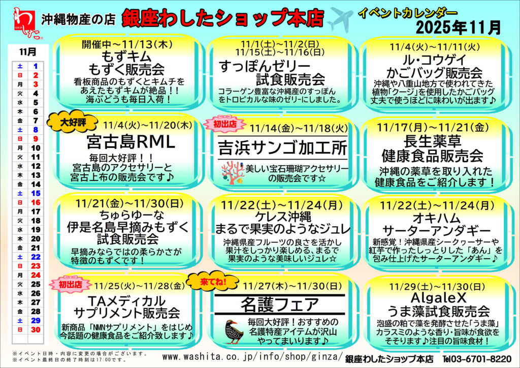 銀座わしたショップ本店 11月イベントカレンダー イベント情報 2025.10.31 銀座わしたショップ本店より11月イベント情報のご案内です。 イベント情報 イベント名 銀座わしたショップ本店11月イベントカレンダー 開催日 2025/11/01 終了日 2025/11/30 URL https://www.washita.co.jp/info/shopinfo/2025/10/30/8517/