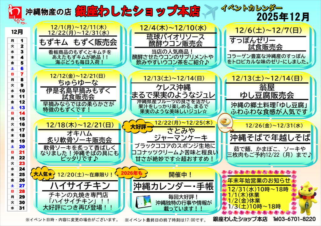 開催中 銀座わしたショップ本店 12月イベントカレンダー イベント情報 2025.12.05 銀座わしたショップ本店より12月イベント情報のご案内です。 イベント情報 イベント名 銀座わしたショップ本店12月イベントカレンダー 開催日 2025/12/01 終了日 2025/12/31 URL https://www.washita.co.jp/info/shopinfo/2025/12/04/8544/