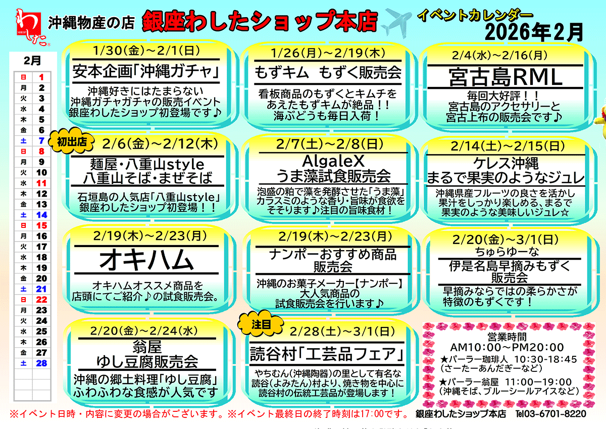 開催中 銀座わしたショップ本店2月イベントカレンダー イベント情報 2026.02.06 銀座わしたショップ本店より2月イベント情報のご案内です。 イベント情報 イベント名 銀座わしたショップ本店2月イベントカレンダー 開催日 2026/02/01 終了日 2026/02/28 URL https://corp.washita.co.jp/shopinfo/9070/